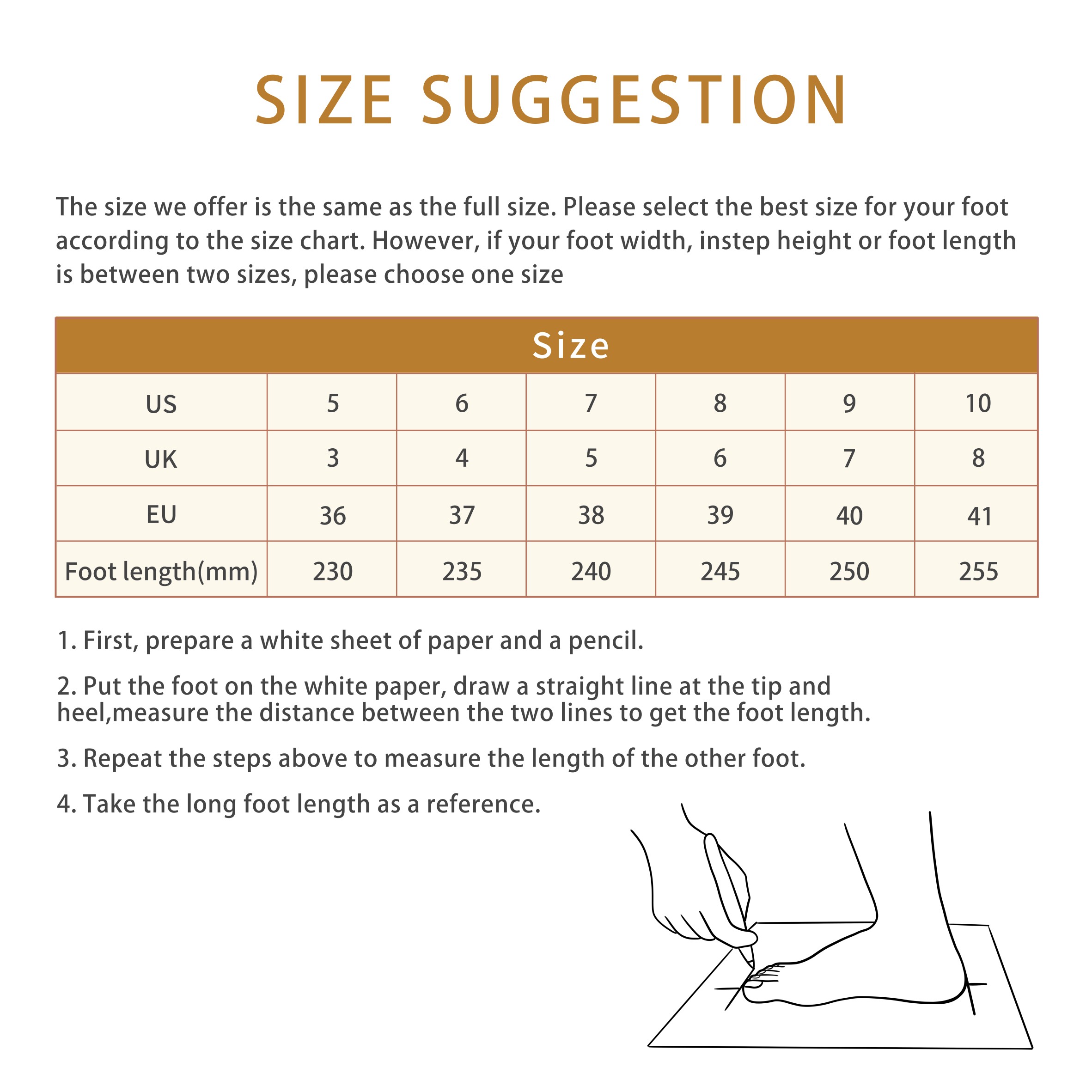 Size suggestion: Please choose the best size for your foot according to the size chart. But if your foot is width, instep height or foot length is between two sizes, please choose one size larger.
