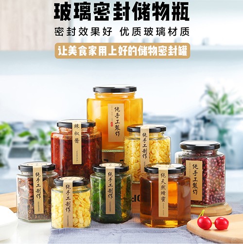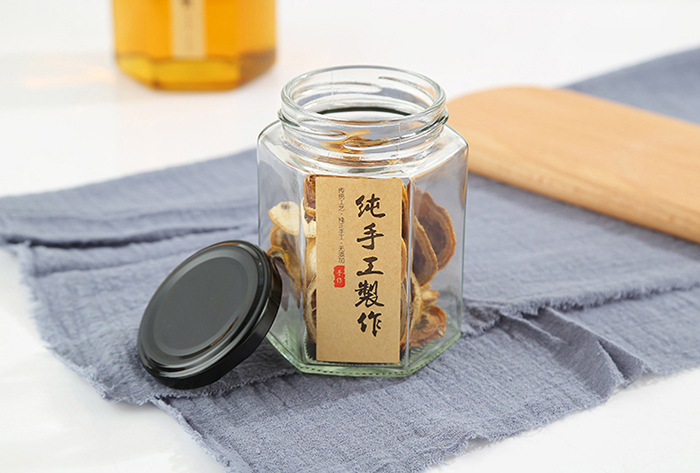 Wholesale Hexagon Honey Food Storage Clear Glass Jar With Metal Cap |